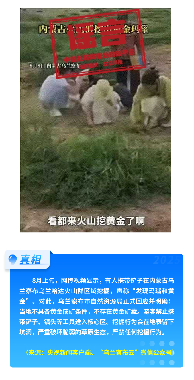 8月正值暑期,文旅消費旺,各類賽事多,相關謠言時有出現(xiàn)。“內(nèi)蒙古烏蘭哈達火山景區(qū)有黃金”虛假信息,誤導游客違規(guī)挖掘,破壞生態(tài)環(huán)境;“山西大同華嚴寺殿墻遭游客刻字”傳言,實為游客用手指在浮塵上涂畫并非刻劃。還有不法分子編造傳播“成都世運會招募兼職,需交‘保證金’”“世運會內(nèi)部票”“大神代搶”等信息,假冒官方名義實施詐騙,侵害公眾權益。