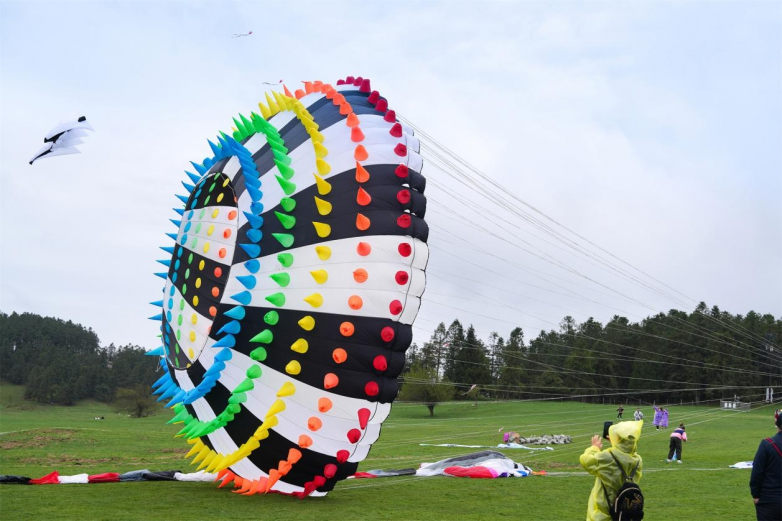 最引人入勝的還屬山東濰坊非遺“滾地龍”,只見其在表演人員的操控下翻滾騰躍,如彩虹旋風(fēng)掠過草地,游客們爭(zhēng)相伸手觸摸這份來自“風(fēng)箏之都”的祝福。在現(xiàn)場(chǎng),旋轉(zhuǎn)、俯沖、急劇爬升……這些看似風(fēng)箏不可能完成高難度動(dòng)作引來游客陣陣驚嘆。