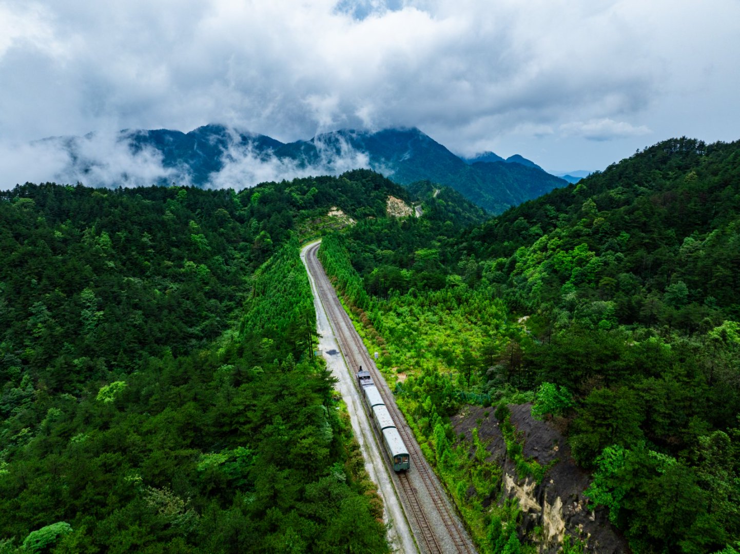 乘坐纜車登頂明月山后,艾芙琳漫步青云棧道,俯瞰月亮湖的碧波,并體驗(yàn)了高山小火車“嫦娥號(hào)”,沿途的云海、森林與村落交織,宛如畫卷。 明月山小火車穿行在山野間。陳旅 攝