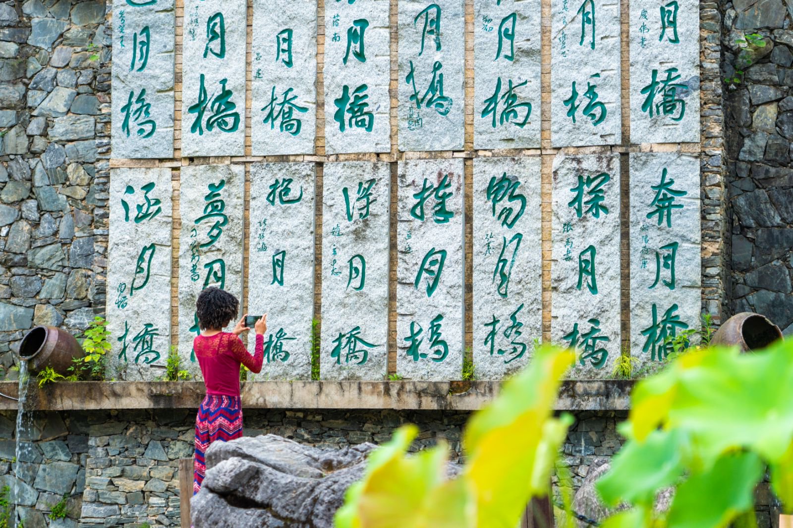 隨后,艾芙琳探訪了入選“國(guó)家森林養(yǎng)生重點(diǎn)建設(shè)基地”的二十四橋明月園。這座占地3150畝的綜合性莊園以月亮文化和橋文化為主題,融合農(nóng)業(yè)觀光、森林康養(yǎng)、民俗體驗(yàn)于一體。園內(nèi)自產(chǎn)自足的綠色食材、百畝花海、24座特色小橋,以及書法家創(chuàng)作的“明月”主題作品,令艾芙琳連連稱贊:“這里實(shí)現(xiàn)了人與自然的完美共生。” 艾芙琳正在拍攝石刻書法作品 陳旅 攝