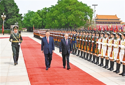 5月16日上午,國家主席習(xí)近平在北京人民大會(huì)堂同來華進(jìn)行國事訪問的俄羅斯總統(tǒng)普京舉行會(huì)談。這是會(huì)談前,習(xí)近平在人民大會(huì)堂東門外廣場為普京舉行隆重歡迎儀式。
