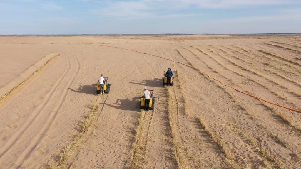 在內(nèi)蒙古巴彥淖爾市烏拉特后旗西補(bǔ)隆林業(yè)管護(hù)中心,4臺裝有履帶的壓沙機(jī)正在沙地里“插秧”——小推車大小的壓沙機(jī)前方都裝有一個直徑80厘米的大齒輪,壓沙機(jī)前進(jìn)一米,大齒輪就會將早已均勻鋪在沙地上的稻草、秸稈精準(zhǔn)“植”入沙地里。不一會兒,一條條金黃色的沙障“編織”完成,將沙丘牢牢縛住。