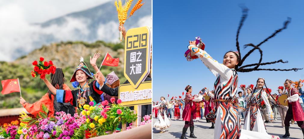 左圖:2025年8月21日上午,彩車上的演員通過西藏拉薩市布達拉宮廣場時向人群揮手,熱烈慶祝西藏自治區(qū)成立60周年。右圖:2025年9月23日下午,群眾載歌載舞,喜迎新疆維吾爾自治區(qū)成立70周年。新華社記者 丁增尼達 畢曉洋 攝