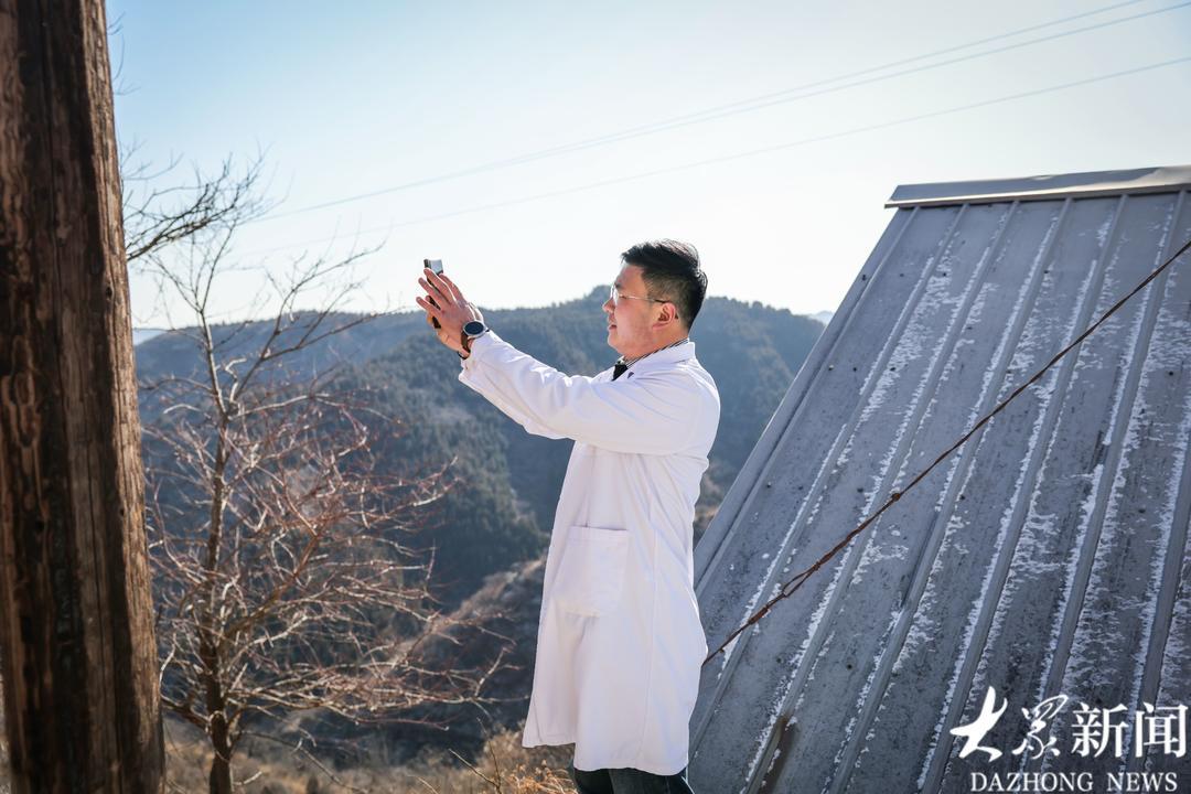 山上信號不好,志愿者劉耀輝正在尋找手機信號。