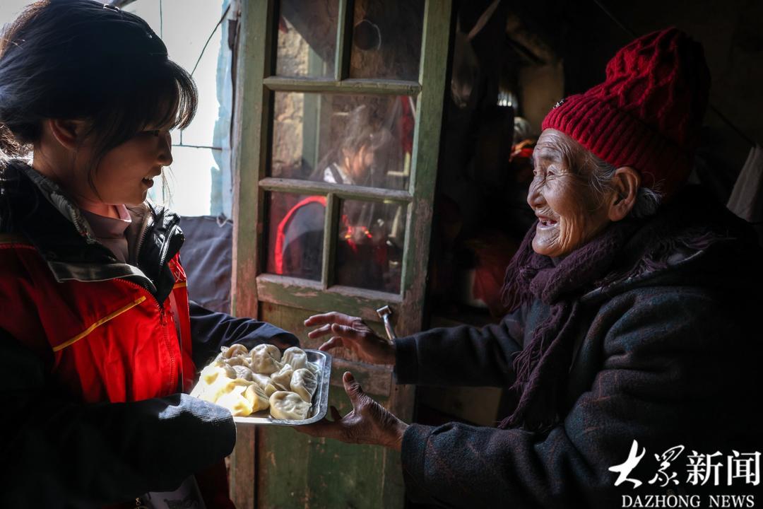 9歲的小志愿者劉梓瑜為88歲的李元花送來餃子。