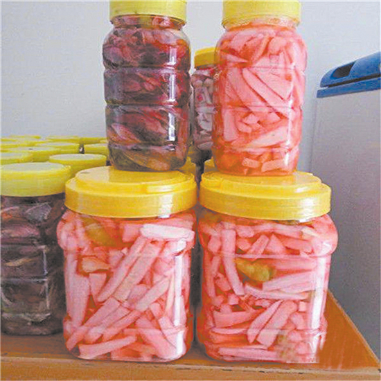買(mǎi)些紅皮蘿卜,洗凈,晾干水氣。切成條塊,塞入陶罐、玻璃瓶或塑料瓶子里,放少許精鹽、姜片、花椒、尖椒辣子,注入涼開(kāi)水淹沒(méi)后,擰緊瓶蓋,整整齊齊擺在一起,慢慢泡。不幾日,瓶子里的蘿卜紅潤(rùn)潤(rùn)的,色彩美妙,芳香四溢。松開(kāi)蓋兒,就可以吃了。咬一口,清脆爽口,酸、辣、麻、咸、鮮,纏綿味蕾,越咀嚼越香。