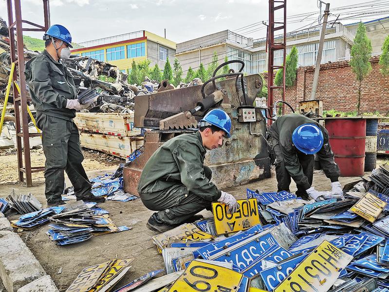 5月26日,市交警支隊(duì)車管所在商洛市磊寶報(bào)廢汽車回收拆解有限責(zé)任公司開展機(jī)動(dòng)車號(hào)牌集中銷毀活動(dòng),對(duì)2019年辦理轉(zhuǎn)移登記號(hào)牌、殘損號(hào)牌、辦理注銷業(yè)務(wù)回收的廢舊號(hào)牌以及路面秩序查扣的假牌套牌等車牌進(jìn)行逐塊切割、解體銷毀,共銷毀廢舊號(hào)牌1.2萬(wàn)面。(宋雨萌攝)