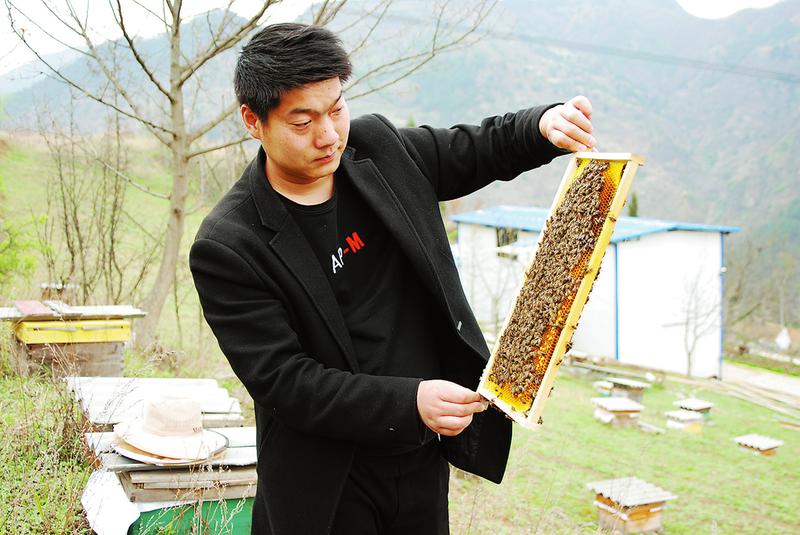 四月的商洛大地,披綠戴紅,春意盎然。中流村的山坡上、田野里整齊地擺放著一個個小木箱,為春日增添了一道特殊的風(fēng)景。那小小的蜂箱里裝著的中華蜂是李海亮的寶貝。與蜂初識,李海亮便一見“傾心”。為了養(yǎng)蜂,他甘愿放棄城市里月薪過萬元的總經(jīng)理工作,毅然回鄉(xiāng)當(dāng)起了蜂農(nóng),開啟了“甜蜜”事業(yè)。