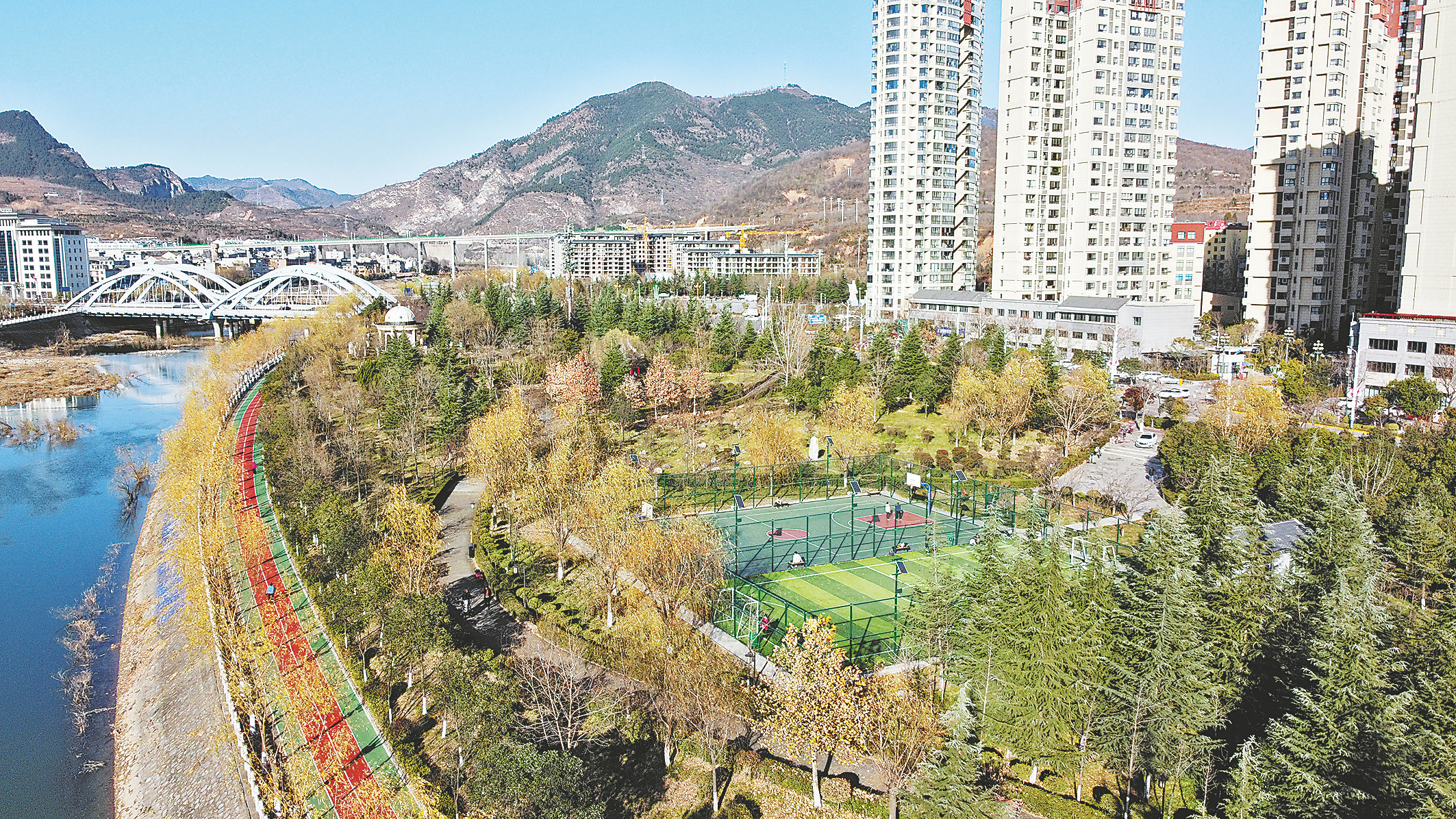 我市在丹江公園內(nèi)建有籃球場、乒乓球場等多個運動場,它集生態(tài)功能、運動功能于一體,是開放式全民健身場所。它賦予了公園新的內(nèi)涵,融生態(tài)、全民健身和智慧理念為一體,使得丹江公園綜合性功能發(fā)揮到最大,真正成為全民可參與的綠色體育公園。圖為位于丹江公園西部、毗鄰構(gòu)峪大橋的運動場,里面設(shè)備齊全、環(huán)境優(yōu)越,周圍景色宜人。