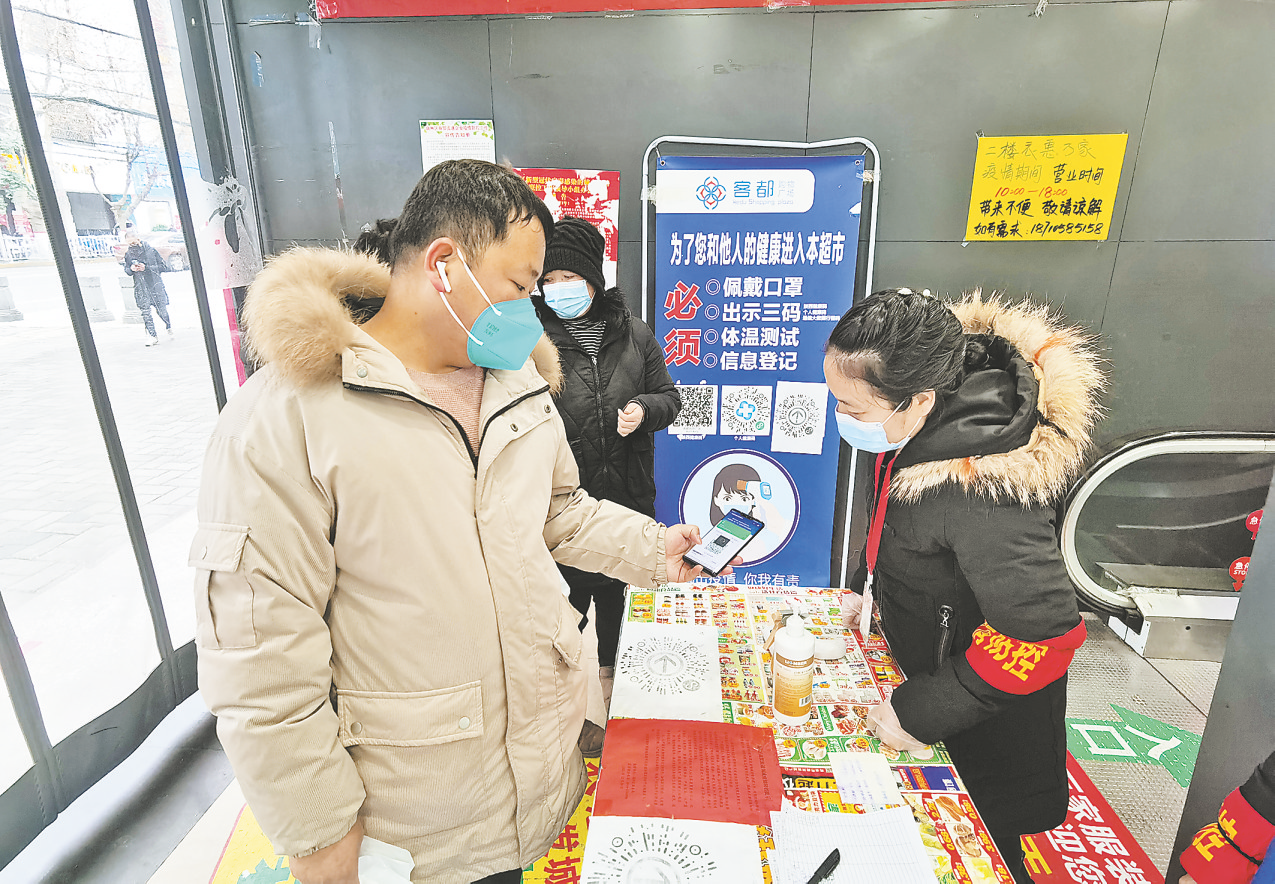 “進店請掃碼!健康碼與行程碼都必須掃。”1月8日9時許,在客都購物廣場入口處,工作人員正在引導(dǎo)顧客測量體溫、掃二維碼。主管高建惠介紹,自去年12月份至今,超市對進店顧客嚴(yán)格查驗健康碼和行程碼后才能進入。