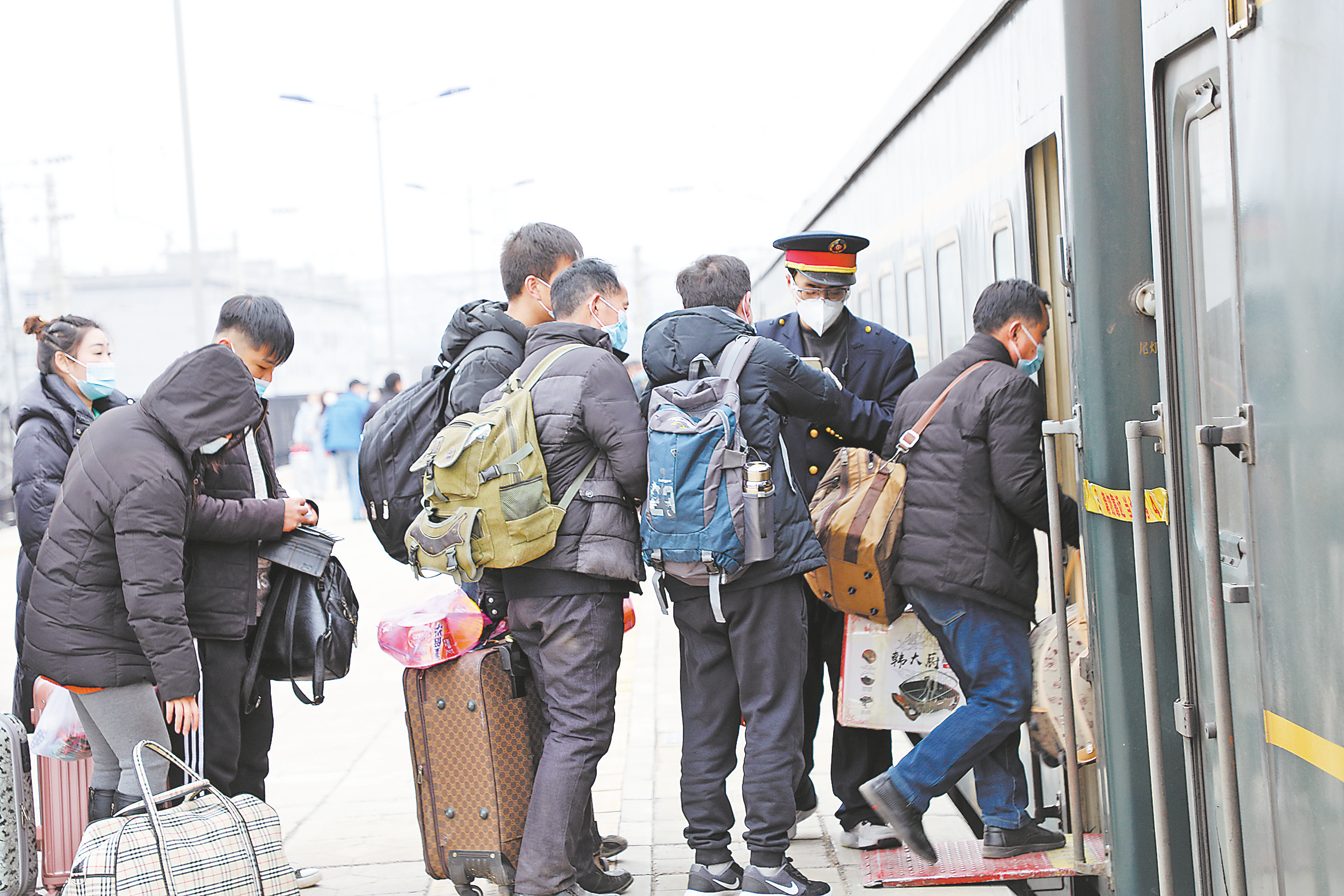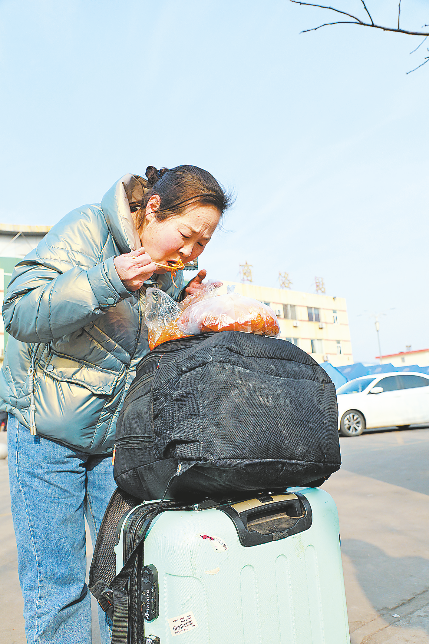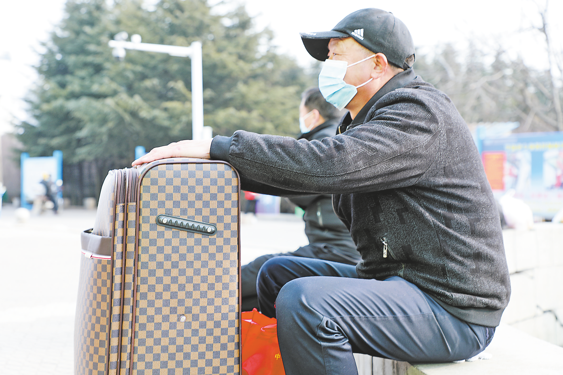 2月10日,在商洛火車站前空地上的一個(gè)角落里,坐著一位中年人,口罩擋住了臉龐,眼尾處深深的皺紋顯露出他的年齡。不像其他人在玩手機(jī)或聊天,他孤獨(dú)地坐在那里,手搭在行李箱上,眼睛盯著空曠的前方,保持了良久。