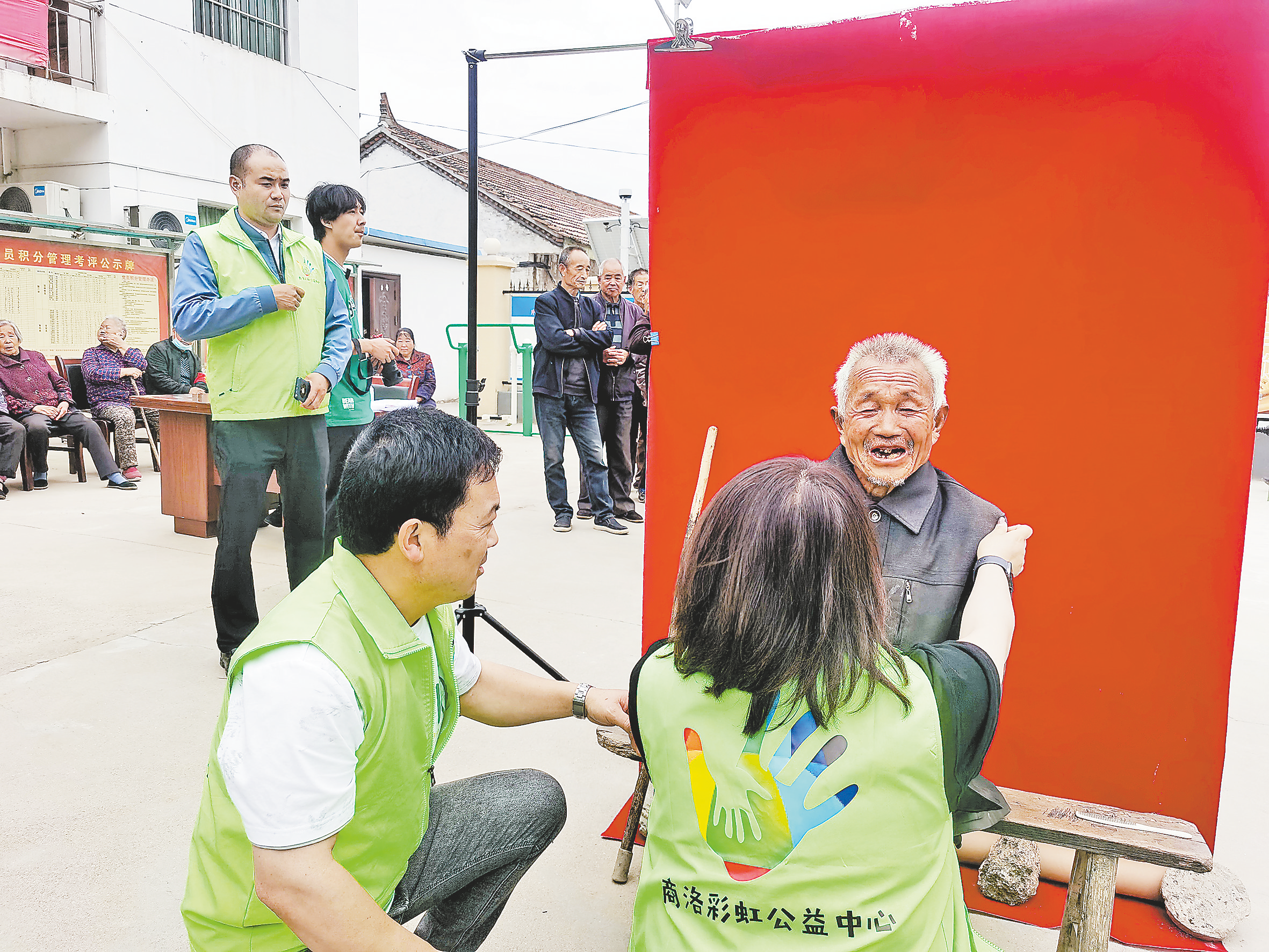 △志愿者在商州區(qū)牧護(hù)關(guān)鎮(zhèn)泉源村為老人拍攝照片