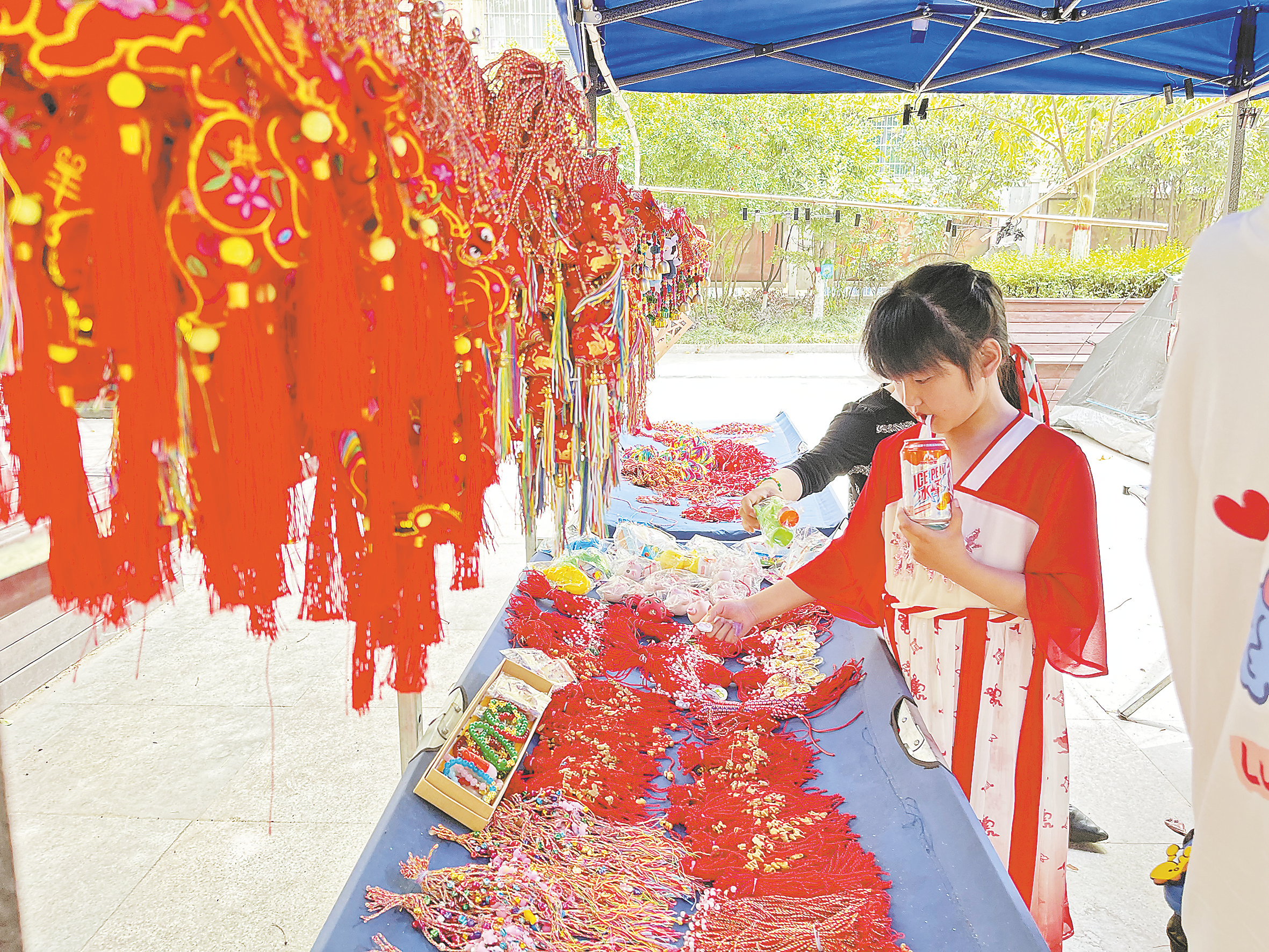 身穿漢服的女孩挑選端午飾品