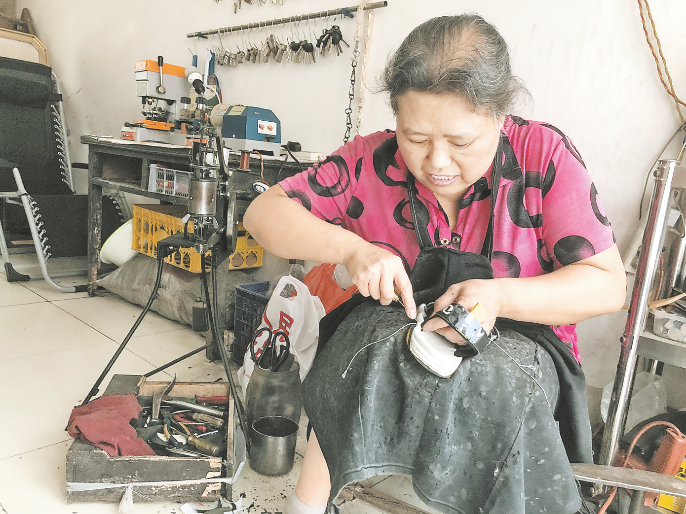 “底子粘好了,你穿上試試平不平,硌腳的話我再給收拾。”王敏將粘好底的鞋子遞給顧客,顧客試穿后很滿意,連連道謝。顧客正準(zhǔn)備付錢時,王敏看到顧客背包帶子有一處快要磨斷了,便說:“你把包卸下來,我給你把帶子一縫,免得過幾天斷了沒法背了。”給修鞋機(jī)上的縫紉針穿上和背包同樣顏色的線,僅僅幾秒鐘,包上的帶子便修好了。顧客問加上縫帶子一共多少錢,王敏笑著說,縫帶子不收錢了,順手的事,不費工夫。