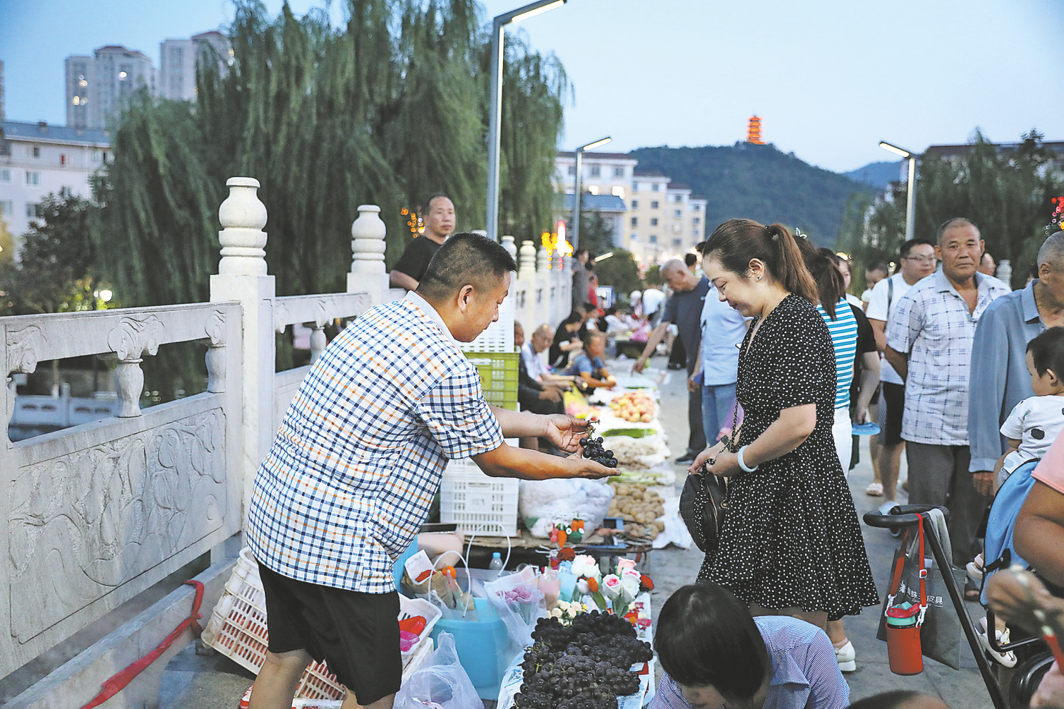 市民正在步行橋的地攤旁選購水果