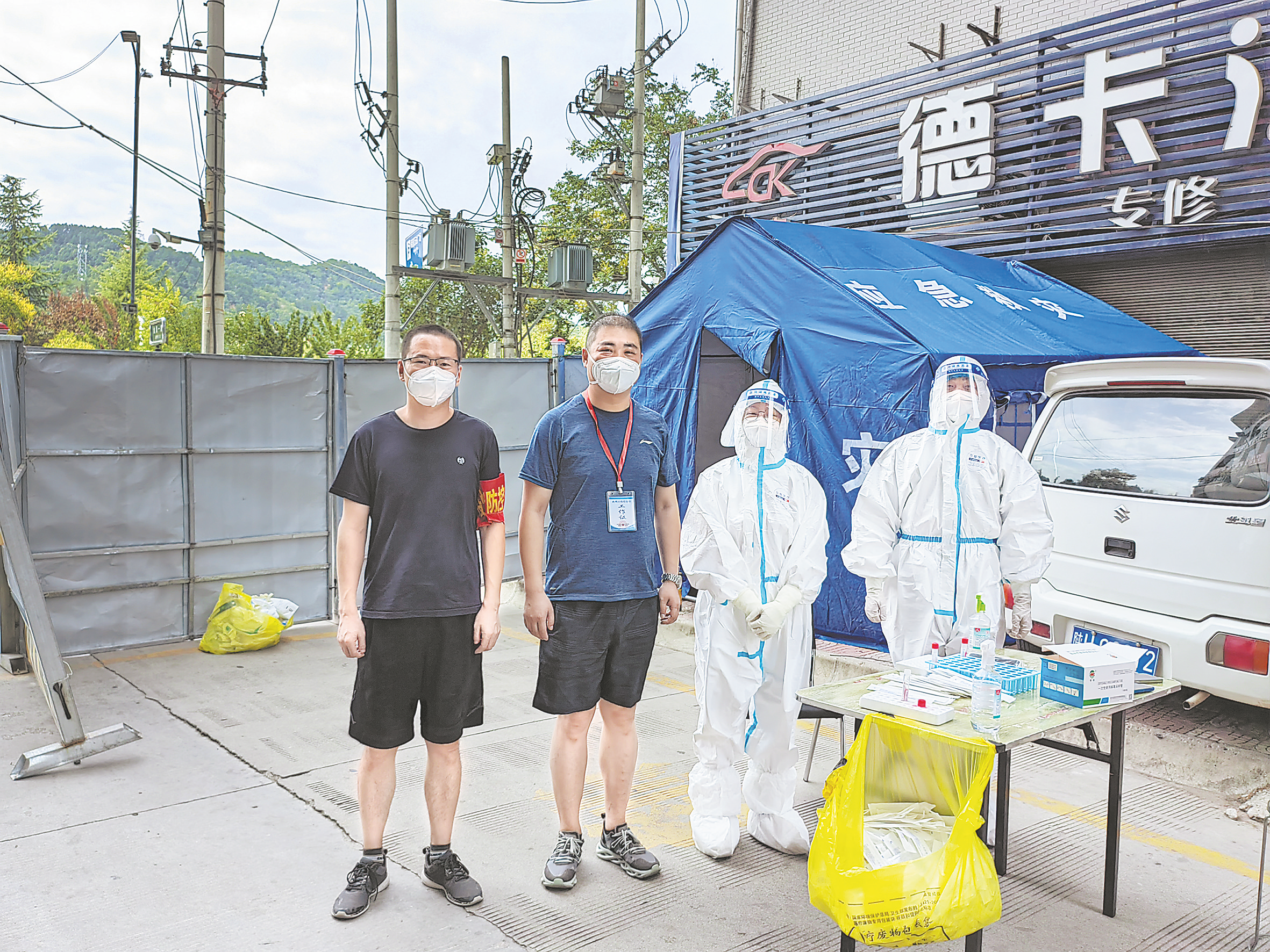 8月20日9時許,天下起了淅淅瀝瀝的小雨,在商州區(qū)金源一路片區(qū)核酸檢測采樣點,下沉干部席裕和其他工作人員一起