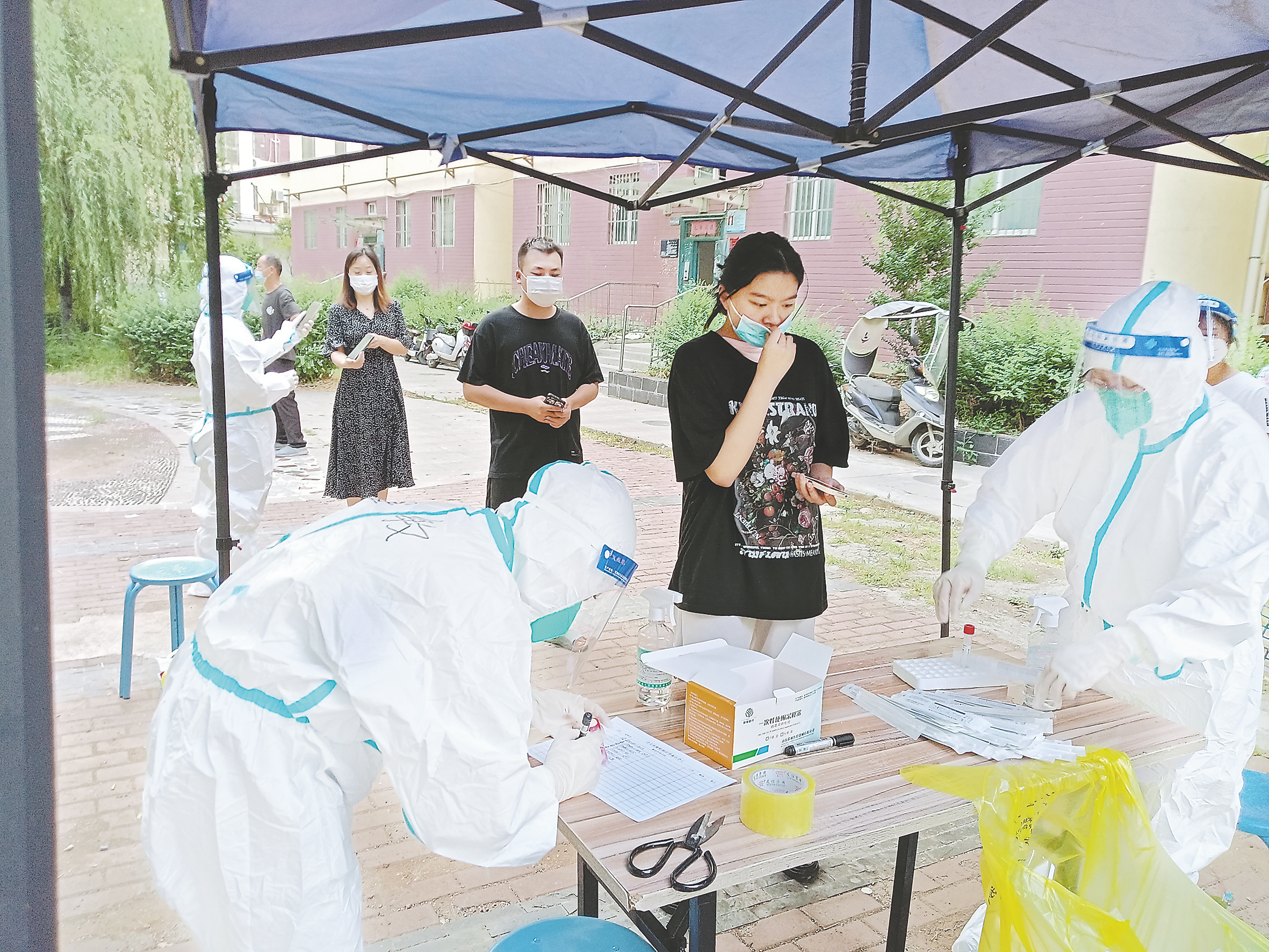 有個別居民因等待時間過長鬧起了情緒,席裕耐心解釋:“醫(yī)務(wù)人員為出行不便的群眾上門做核酸檢測了,馬上就回來,你可以坐著等一會,不要著急。”說著便讓出了凳子。