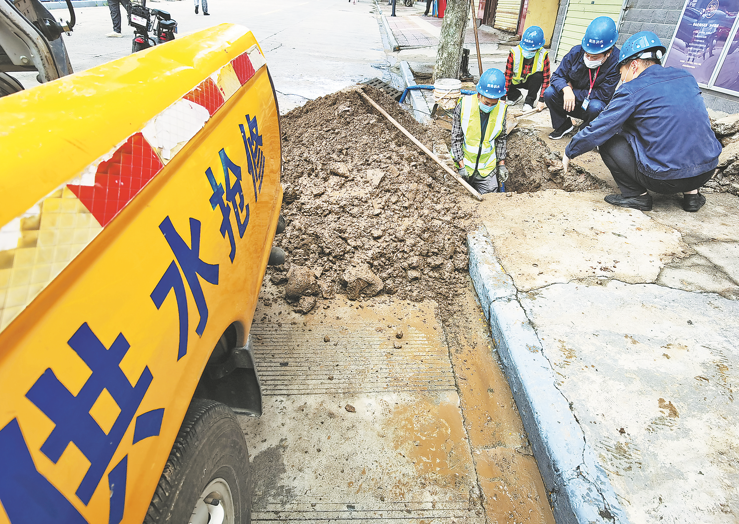 市自來水公司應(yīng)急搶修分隊(duì)正在搶修中