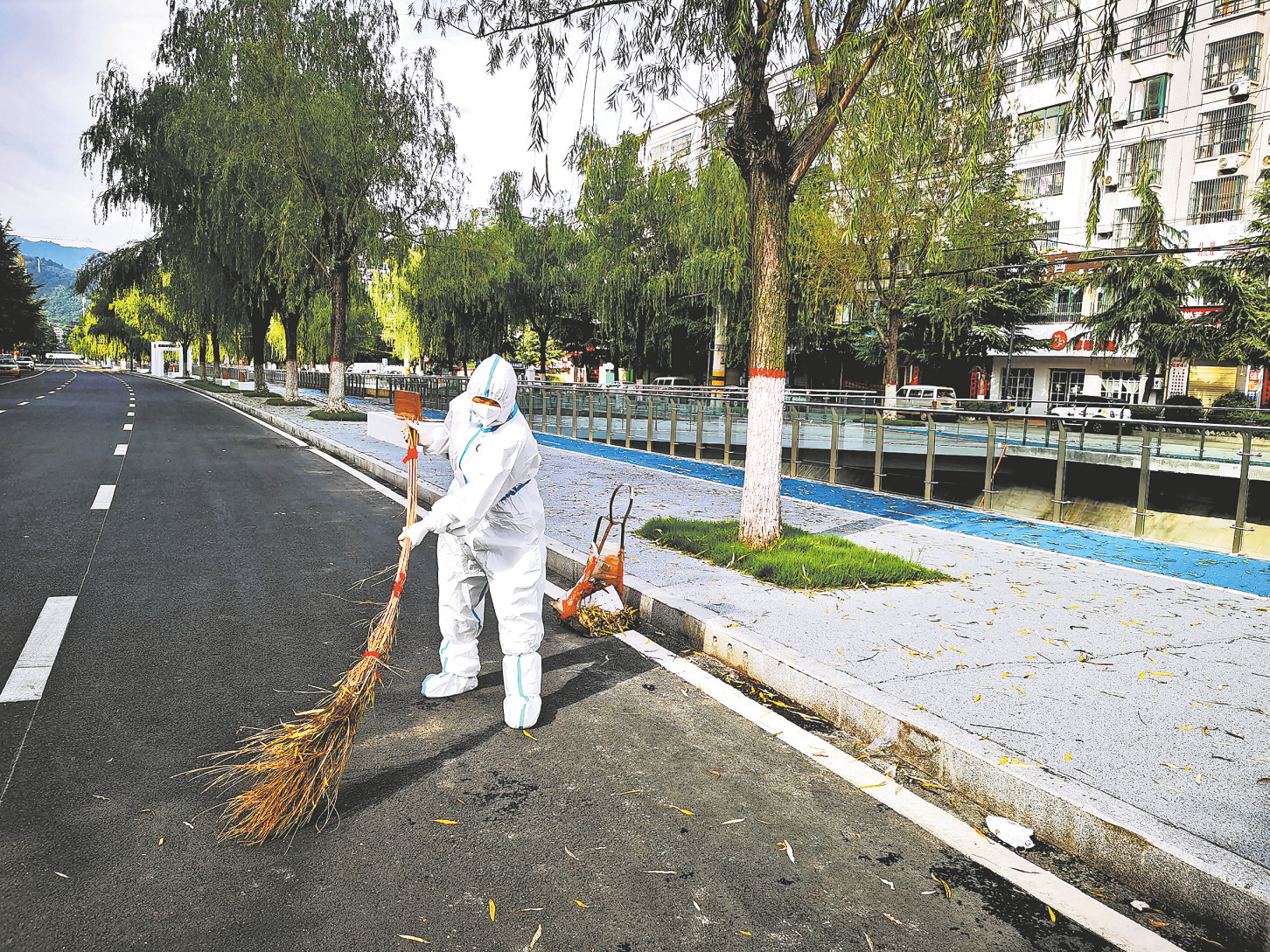 環(huán)衛(wèi)工人穿著防護(hù)服上崗