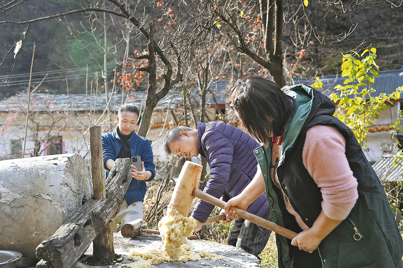 3個年輕人因為沒有經(jīng)驗,打了近1個小時,仍跟鄭父口中描述的糍粑有差距。實在揮不動榔頭了,就你20下,我20下,換著來。額頭出了汗,力氣也幾乎用完了,糍粑仍然沒成形。于是,他們叫來鄰居家的大嬸指導(dǎo),大嬸給出的答復(fù)是:“再堅持打一會兒,拉起來很細的絲就成了。”于是,3個人又接著打,直到陽光從院子已經(jīng)回到半山腰,糍粑漸漸才成形。