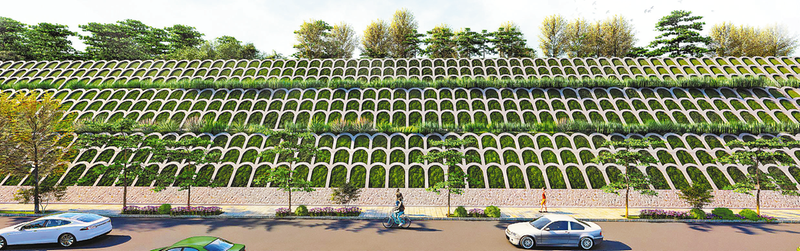 環(huán)城北路邊坡治理工程點(diǎn)狀分布于環(huán)城北路全段道路兩側(cè)。工程主要通過拱形骨架、抗滑樁、混凝土擋墻加固因2021年暴雨損毀的護(hù)坡,并對護(hù)坡周邊山體進(jìn)行生態(tài)修復(fù),實(shí)施邊坡立體綠化,有效改善環(huán)城北路兩側(cè)生態(tài)環(huán)境,有力保障城市道路運(yùn)行安全。