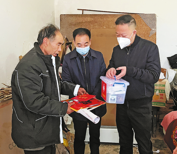 1月12日,山陽縣委組織部負(fù)責(zé)人帶隊(duì)來到高壩店鎮(zhèn)黃土凸村、高壩街社區(qū)、富橋村慰問駐村第一書記、駐村工作隊(duì)員,看望生活困難戶,為困難戶和監(jiān)測(cè)戶送去愛心大禮包,確?;鶎尤罕娺^一個(gè)祥和的春節(jié)。(本報(bào)記者 賈書章 攝)