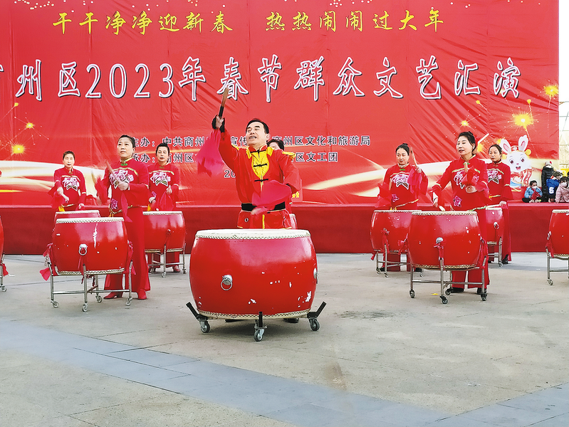 1月29日,在市區(qū)西街大都匯廣場(chǎng),商州風(fēng)威鑼鼓隊(duì)為市民獻(xiàn)上歡慶鑼鼓鬧新春節(jié)目,吸引了眾多群眾觀看,為新年?duì)I造了熱熱鬧鬧的氛圍。 (本報(bào)記者 賈書(shū)章 攝)