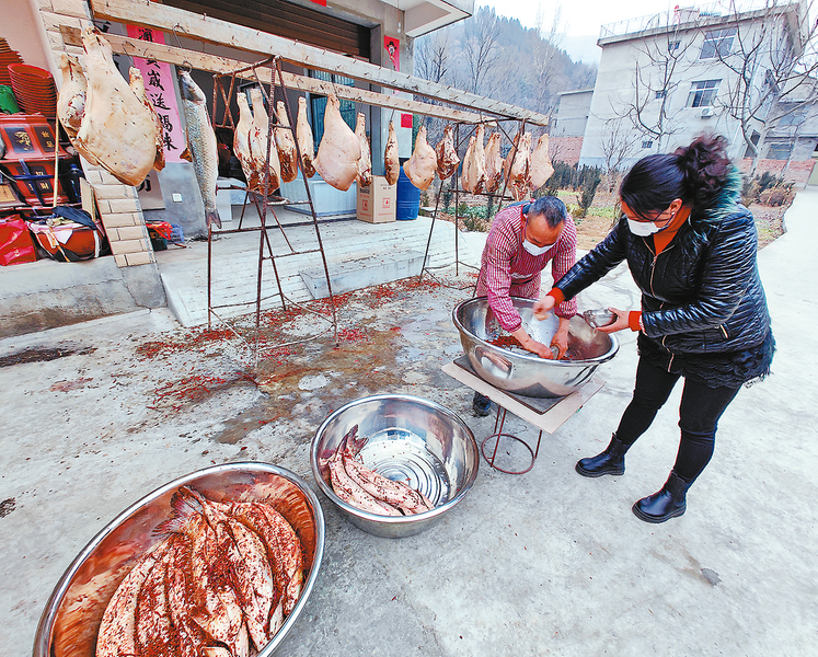 張全東介紹,春節(jié)前他家露臺上、院子里到處掛滿臘肉,有熏制的、有自然風干的,有麻辣的、有五香的,做法不同,口感風味也不一樣,傳統(tǒng)的農家臘肉已經被他開發(fā)成了不同的特色產品。春節(jié)前后,臘肉成為供不應求的特色年貨,最多的時候一天他要向西安運送3貨車的臘味,價值20多萬元。