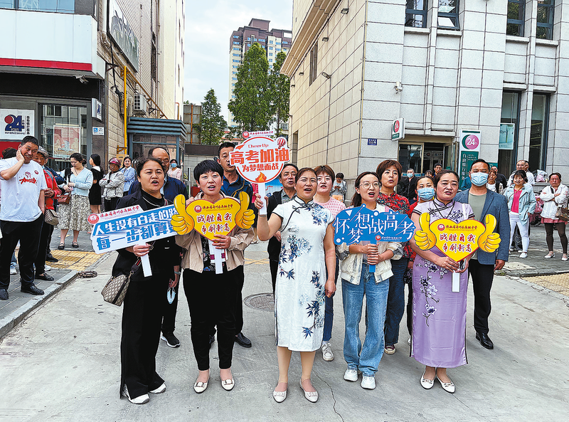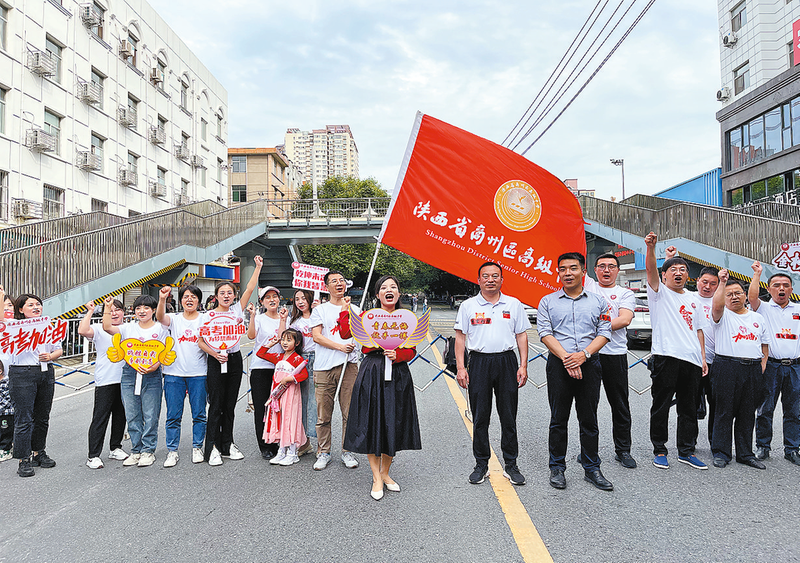 8時(shí)許,商洛市初級(jí)中學(xué)考點(diǎn)門口已經(jīng)站滿了考生、家長(zhǎng)、考場(chǎng)工作人員等,多名老師站在路邊高舉“懷夢(mèng)想戰(zhàn)高考”“高考加油”“為夢(mèng)想而戰(zhàn)”的牌子,揮舞著印有“氣勢(shì)如虹,金榜題名”的大旗,為每一位考生加油。“我們這次一共組織了60多名老師來(lái)給學(xué)生送考,為他們鼓勁打氣。”商州區(qū)高級(jí)中學(xué)副校長(zhǎng)魏智慧說(shuō),“4年來(lái),每逢高考,我們學(xué)校都會(huì)統(tǒng)一定制‘高考戰(zhàn)服’,鼓勵(lì)學(xué)生以昂揚(yáng)的姿態(tài),自信地邁向考場(chǎng),拼盡全力為夢(mèng)想奮戰(zhàn)。”