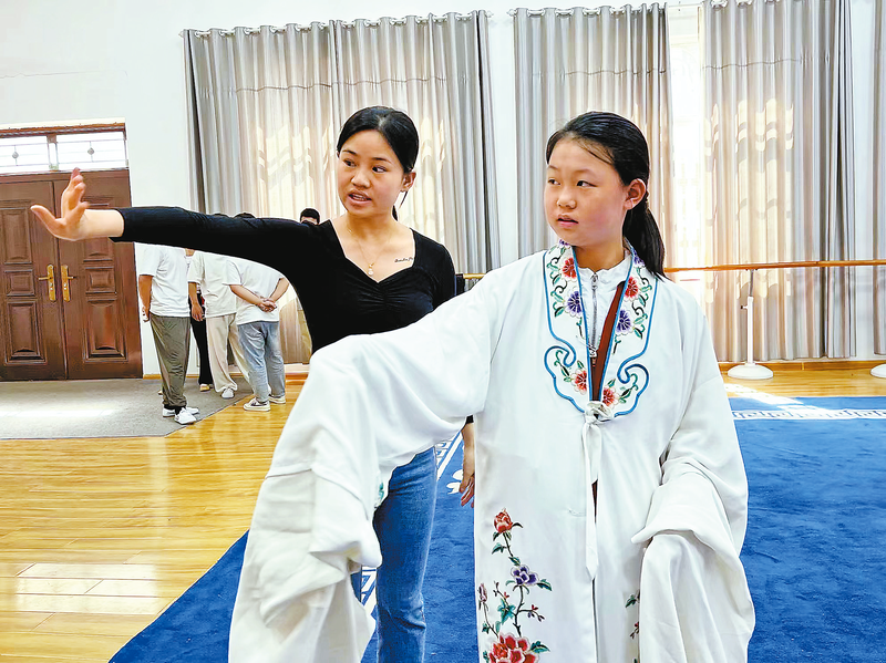 參觀完展區(qū),小記者繼續(xù)前往排練廳,了解戲曲演員幕后的故事。行云流水的水袖、左右晃動(dòng)的帽翅、空中旋轉(zhuǎn)的手帕……11名演員在排練廳內(nèi)給小記者表演了拿手絕活,引來全場(chǎng)喝彩?;?dòng)環(huán)節(jié)中,小記者踴躍嘗試各種戲曲道具。“水袖要擺動(dòng)起來才好看,兩只手注意擺動(dòng)的方向。”在專業(yè)演員的指導(dǎo)下,一名女生擺動(dòng)起長(zhǎng)長(zhǎng)的袖子,學(xué)得有模有樣。幾名男生對(duì)帽翅很好奇,爭(zhēng)相戴在頭上左右晃搖,大家的學(xué)習(xí)熱情得到了老師的贊賞。