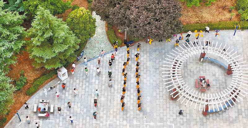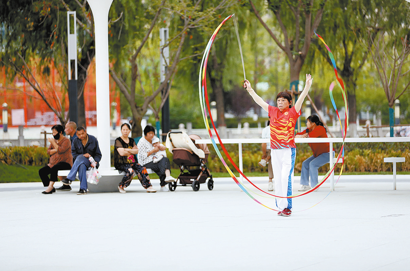 清晨,群眾在綠意環(huán)抱中恣意跳起廣場舞。
