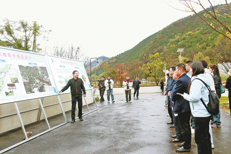 采訪團(tuán)成員在展板前認(rèn)真聆聽東坡院子項目建設(shè)情況。