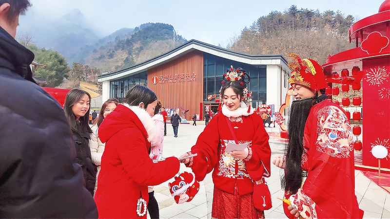 2月21日,在秦嶺天竺山景區(qū)內(nèi),“福祿壽喜財(cái)”NPC與游客親切互動(dòng),派發(fā)新春祝福。