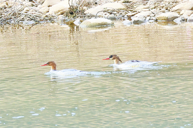 兩只中華秋沙鴨在洛河中自由覓食。(本報通訊員 石 強 攝)