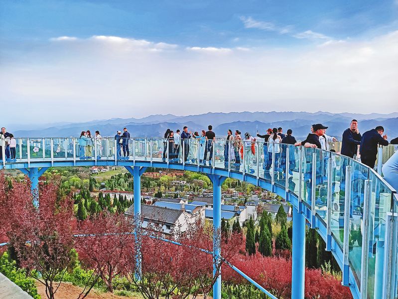 清明假期,我市精心推出系列特色活動,吸引眾多游客前來踏青賞玩。圖為4月5日,游客在商州區(qū)金鳳山生態(tài)公園玻璃棧道觀景臺觀賞風(fēng)景、打卡拍照。 (本報通訊員 彭 濤 攝)