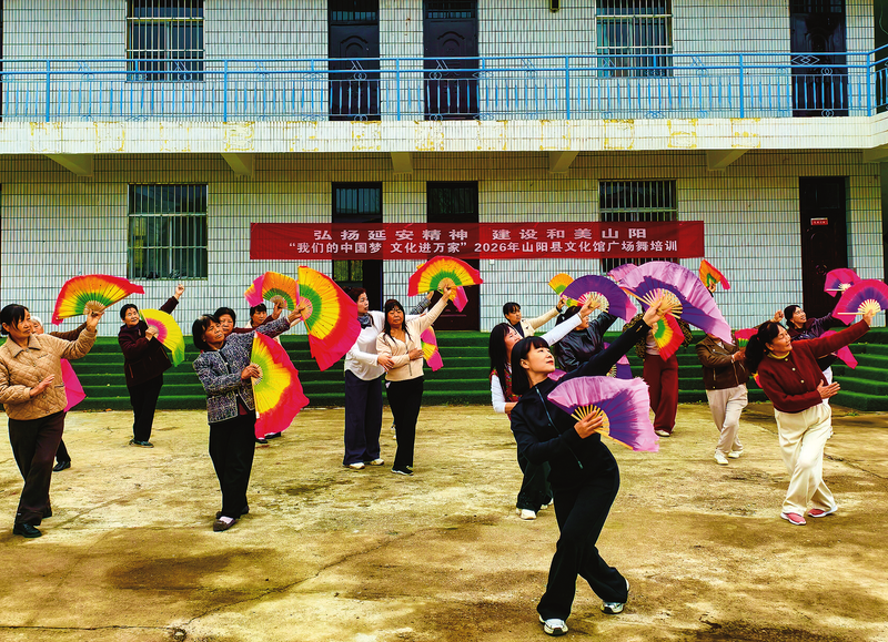 △近日,山陽(yáng)縣文化館先后在十里鋪街道高二社區(qū)、城關(guān)街道張?jiān)鐓^(qū)等地開(kāi)展“弘揚(yáng)延安精神 建設(shè)和美山陽(yáng)——我們的中國(guó)夢(mèng) 文化進(jìn)萬(wàn)家”廣場(chǎng)舞培訓(xùn)。山陽(yáng)縣文化館選派專業(yè)人員精心為基層舞蹈愛(ài)好者進(jìn)行教學(xué)指導(dǎo),以文藝培訓(xùn)傳承延安精神、豐富群眾文化生活。圖為文化館舞蹈培訓(xùn)老師正在高二社區(qū)開(kāi)展《東方紅》扇子舞培訓(xùn)。(本報(bào)通訊員 王榮金 攝)