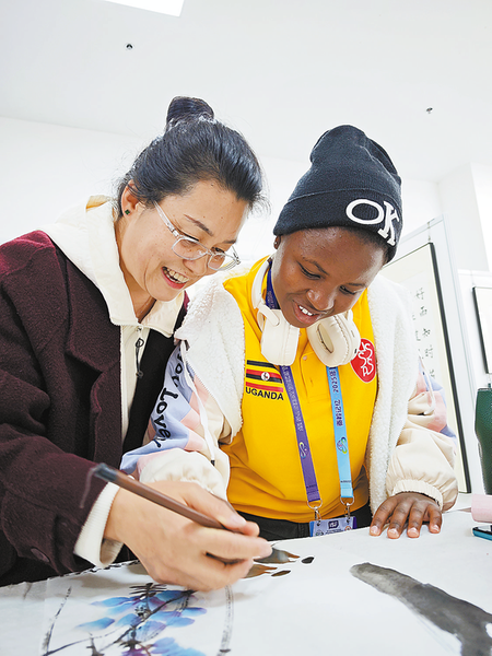 12月9日,參賽隊員分批走進商洛中學、商州區(qū)高級中學等6所學校,開展文化體驗日活動。圖為商洛中學老師教烏干達運動員畫國畫。 (本報記者 景 康 攝)