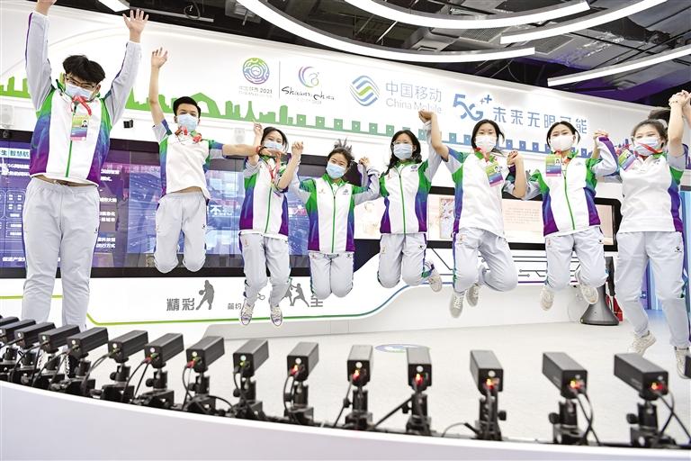 8月13日, 在十四運會賽事指揮和新聞媒體中心,一款由72臺相機組成、可從多個角度拍攝運動場景的5G+AI相機,受到體驗者喜愛。 記者 杜瑋攝