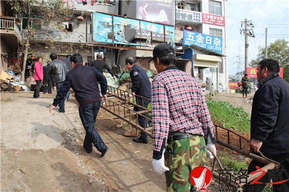 11月11日,商洛市市政處、市城管監(jiān)察支隊(duì)、區(qū)城管局、商州公安分局劉灣派出所四部門聯(lián)合整治清理南大門迎賓大道道路兩側(cè)亂堆放的沙石、柴堆、破損廣告牌、雜物。圖為城管人員清理一占道的鋼筋支架。(田亞鵬 攝影報道)
