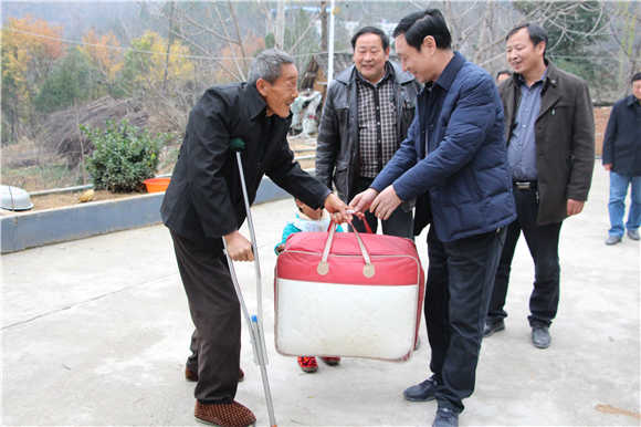 70多歲的貧困戶趙付恩,夾著雙拐一手提著市交通局領(lǐng)導(dǎo)送來(lái)的棉被,一手緊緊地拉著許局長(zhǎng)的手,仿佛遇到了久別的親人,遲遲不肯放開,哽咽的表達(dá)著感激之情。