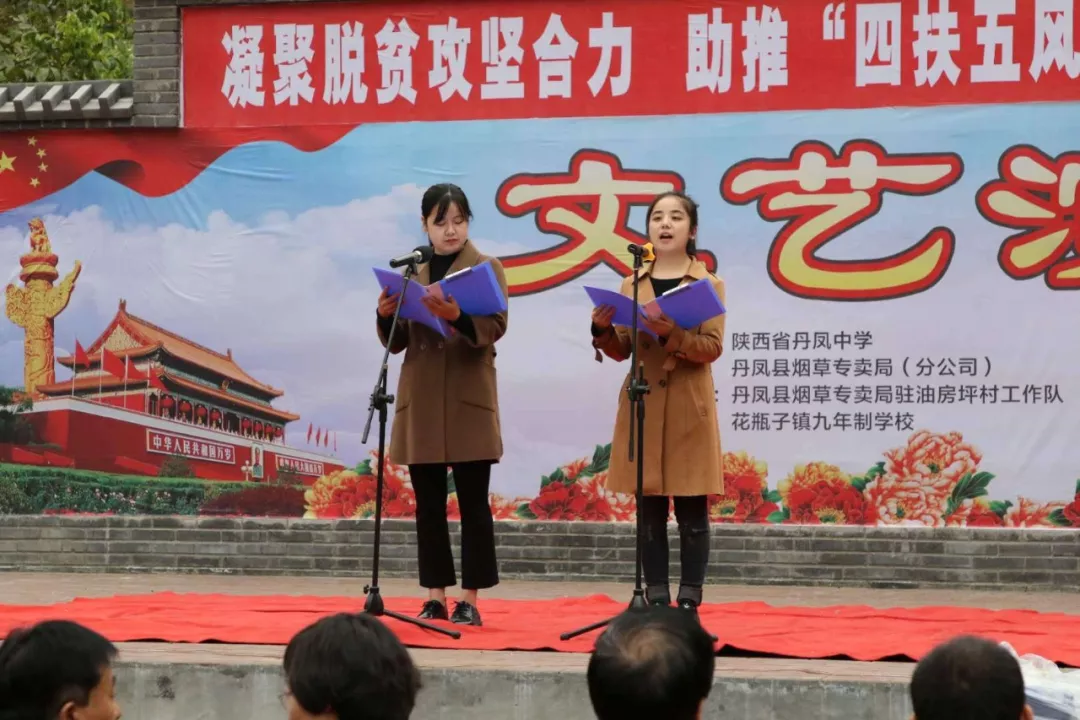 銳意扶貧播大愛(ài),勤勞致富奔小康,正當(dāng)脫貧攻堅(jiān)進(jìn)入攻堅(jiān)拔寨的沖刺階段,10月17日,在舉國(guó)上下開(kāi)展“第五個(gè)全國(guó)扶貧日”之際,由陜西省丹鳳中學(xué)、花瓶子鎮(zhèn)黨委政府、丹鳳縣煙草專(zhuān)賣(mài)局、丹鳳縣國(guó)庫(kù)支付局主辦,丹鳳縣煙草專(zhuān)賣(mài)局駐油房坪村工作隊(duì)、花瓶子鎮(zhèn)九年制學(xué)校、油房坪村民委員會(huì)共同舉辦《凝聚脫貧攻堅(jiān)合力、助推“四扶五風(fēng)六化”共建美麗油房坪村》文藝演出。