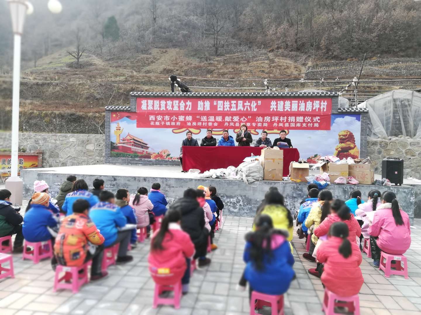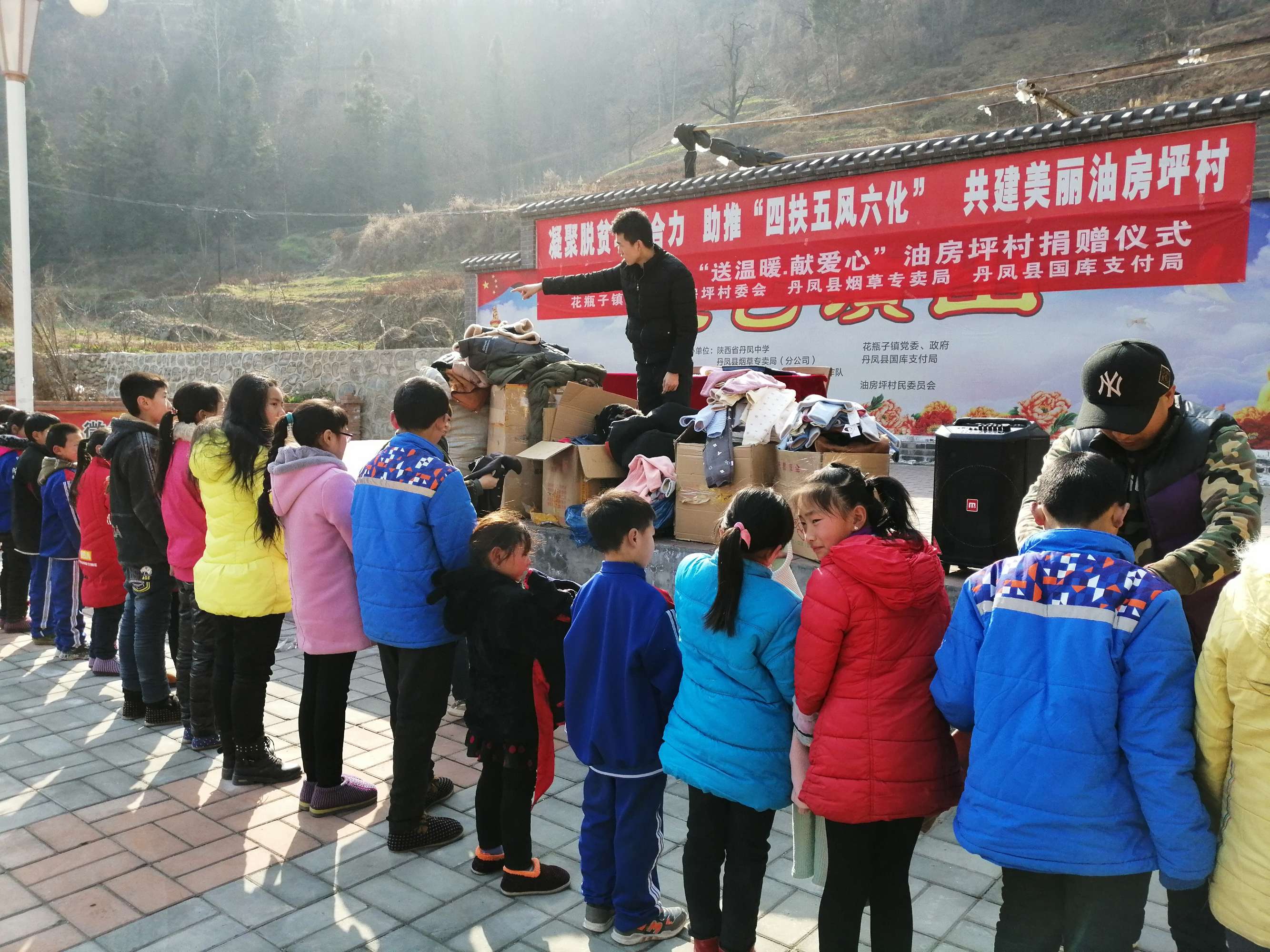 2018年1月19日,西安市小蜜蜂慈善公益組織負責人汪女士,攜手丹鳳縣煙草局黨支部、丹鳳縣國庫支付局黨支部暨花瓶子鎮(zhèn)政府,冒著嚴寒,從西安省城來到油房坪村,開展“送溫暖、獻愛心”溫暖衣發(fā)放儀式,對30名留守兒童發(fā)放羽絨服、保暖內衣、圍巾、耳套、鞋子、裙子等價值1萬余元物品,用實際行動詮釋著人間最質樸的愛,受到捐贈的留守兒童,他們非常感謝黨和人民的關懷以及社會這么多好心人為他們送去的衣物,在以后的生活學習中,學會感恩,以優(yōu)異的成績回報各級領導以及社會的關懷。