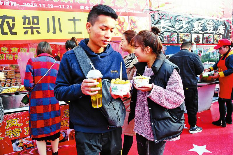 在農(nóng)特產(chǎn)品展臺的東側(cè),各類網(wǎng)紅美食吸引著顧客的味蕾??救庑「珉S著音樂的節(jié)奏快樂地把肉烤得焦香,鐵板豆腐和香蔥、辣椒一起發(fā)出“滋滋”的響聲……色香味俱全的美食琳瑯滿目,光是看著就已經(jīng)大飽眼福。攜三兩好友,吃完長沙臭豆腐,再品上一串黃金蝦球,前方還有更美味的網(wǎng)紅美食在等待。