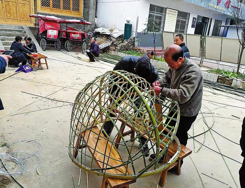丹鳳縣的竹林關(guān)因竹子多而得名。銀花河畔、桃花谷間、村莊邊緣,隨處可見(jiàn)修長(zhǎng)的翠竹。篾匠劉彩堂告訴記者:“龍燈的骨架是用竹子做成的,一般做一個(gè)龍頭,需要50斤竹子。”劉彩堂今年55歲,做得一手好蔑活。只要村上做花燈,劉彩堂都會(huì)前去幫忙,單是竹子的挑選,就有很多講究。斑竹不行,新鮮的、直徑4厘米、竹節(jié)長(zhǎng)的水竹才適合做骨架,這樣的竹子破出來(lái)的竹篾韌性好,更易彎曲。做骨架時(shí),劉彩堂用篾刀將竹子先劈成二分之一,再到四分之一、八分之一,制成合適的竹篾。下一步,就可以制作骨架了。