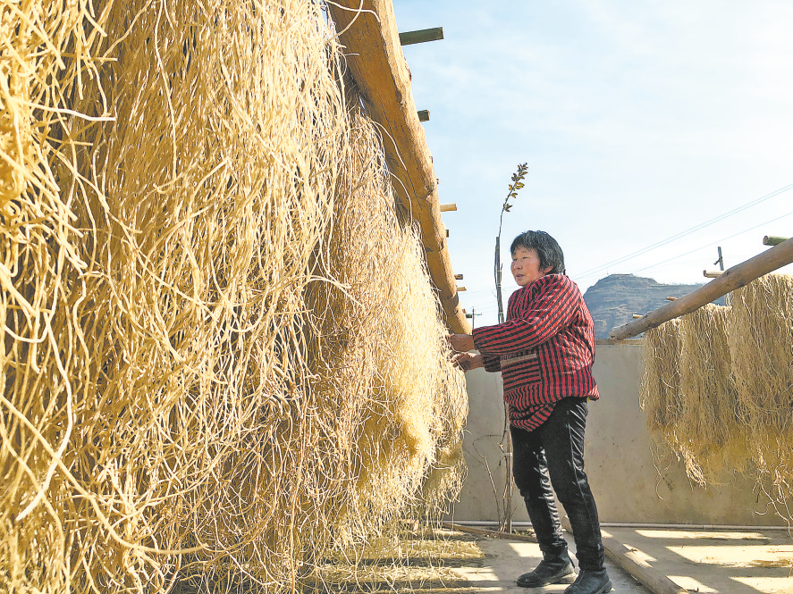 △萬灣社區(qū)充分調(diào)動(dòng)黨員群眾發(fā)展產(chǎn)業(yè),人均年純收入突破2萬元。圖為萬灣村集體經(jīng)濟(jì)粉條加工廠內(nèi),群眾正在晾曬粉條。