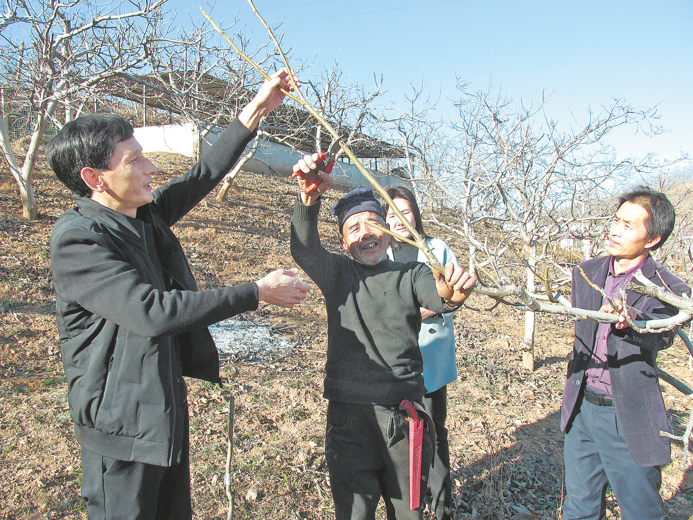 “我給你們說,這核桃樹枝條的修剪要扶弱去強(qiáng)去立,樹高截頂,去交叉枝條……”
