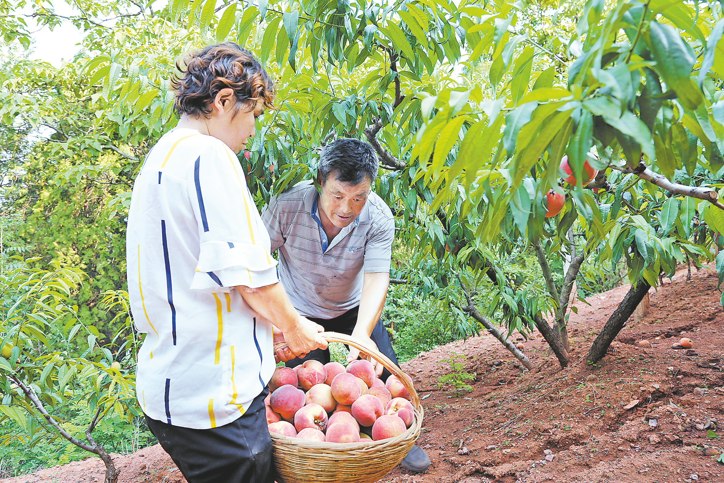 7月13日,在北坪村種植戶彭丹江的桃園里,一個(gè)個(gè)白里透紅的桃子沉甸甸地掛在枝頭,讓人饞涎欲滴。彭丹江和妻子周逢芝穿梭在桃園中,仔細(xì)地查看果樹生長情況。