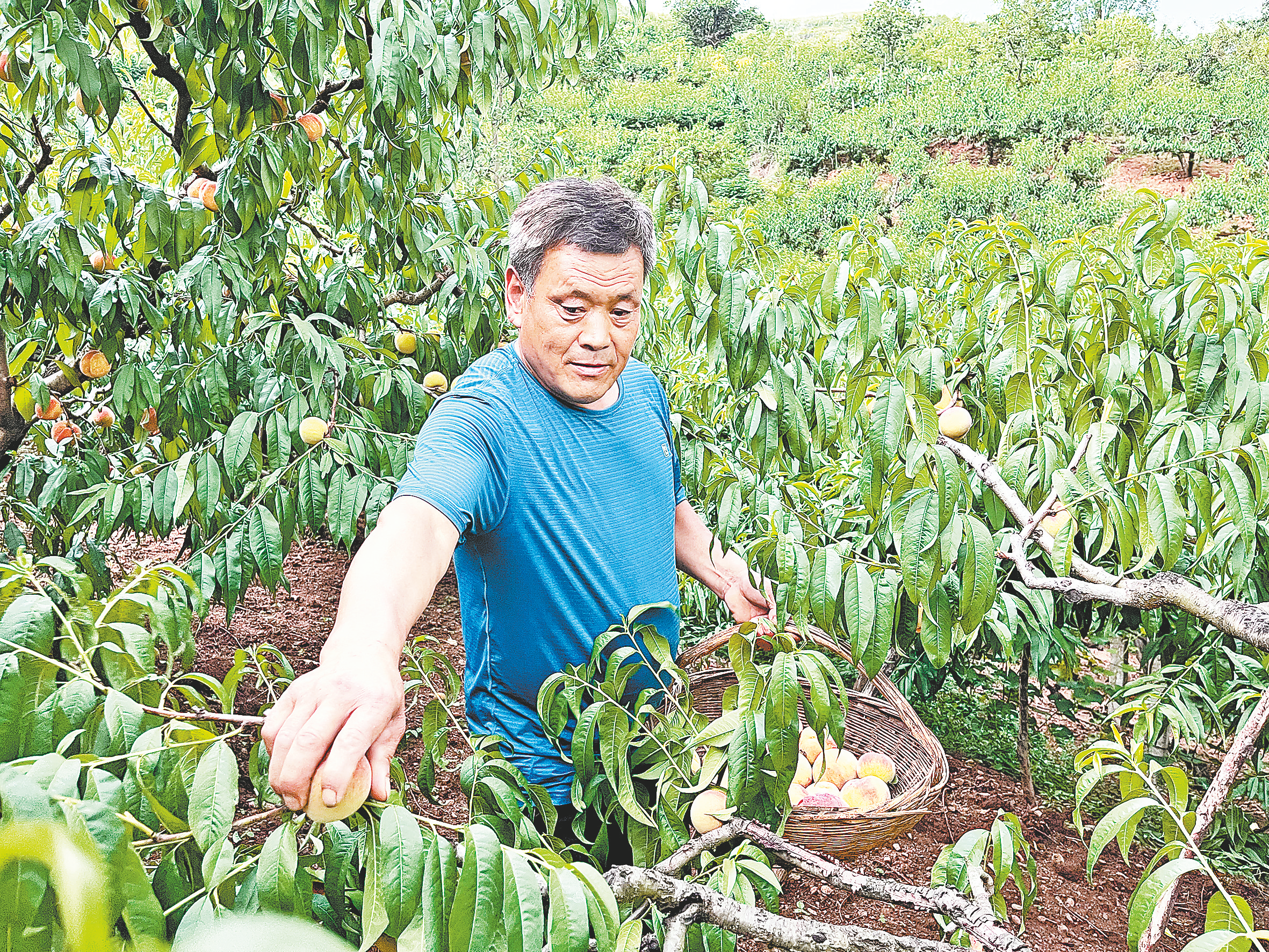 果農(nóng)彭莊存一共種了4畝多地的桃樹,眼看著枝頭上個(gè)頭大、品相好的桃子即將成熟,彭莊存臉上掛滿笑容。他說:“今年科管做得好,你看這桃結(jié)得多么繁,甜度非常好,也能賣上價(jià),加入合作社后一起發(fā)展,省心又高效。”