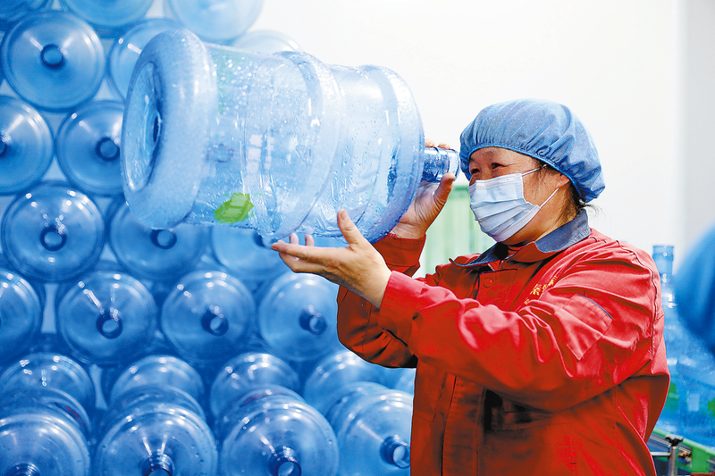 “巖層自涌泉水經(jīng)過原水箱、石英砂過濾、活性炭處理等多道工序后,‘秦嶺活泉’‘秦臻山泉’就被運往商洛市內(nèi)以及西安、天津等地。這口泉水是天然的,水質(zhì)優(yōu),基本無雜質(zhì),一年四季不枯竭。”陽河村黨支部書記張小軍說,“陽河村曾是深度貧困村,80%以上屬于坡地。2018年,我們招商引資建成了這個水廠,目前水廠年收益200萬元不成問題。村上向水廠注資120萬元,每年分到7.2萬元紅利。脫貧戶有8人在水廠務工,人均月收入2200元。”
