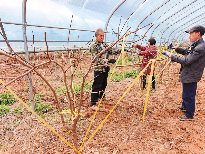 在冬棗大棚內(nèi),務(wù)工群眾忙著為果樹剪枝。